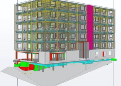 Es handelt sich bei dem System um eineStahlskelettkonstruktion. Die tragende Struktur besteht aus warmgewalztem Stahl und die Ausfachung aus kaltgewälztem Stahl. Die Module werden im Werk in höchster Präzision und Qualität soweit vorgefertigt, dass ein kompletter, fertiger Raum entsteht. Sämtliche Wandbekleidungen bis hin zu Dämmstoffen, Beschichtungen (Farbe), Fliesen etc. werden vormontiert.